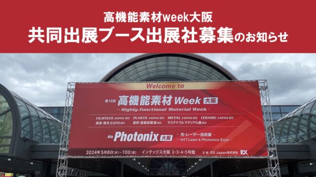 4つの大規模展示会の中で現在、申込できる展示会が「高機能素材week大阪」。2025年5月14日(水)〜16日(金)にインテックス大阪で開催される展示会。バイオプラスチック、機能性繊維、カーボン素材、複合材料など最先端の素材技術が集結する“サステナブルマテリアル展”内に大阪市の共同出展ブースが設置されます。