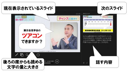なのでスライドに文字を書きすぎる必要がなくなり、万が一話すことをド忘れしても話す内容は自分にだけは見えている、という状況でプレゼンができます。この機能を使えるかどうかで発表者の心理的負担が軽減し、結果としてお客さんに伝わる話になります。