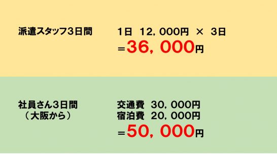 単純に大阪から社員さんを連れて東京の展示会に出展する費用と比較すると派遣スタッフさんに来てもらうほうがだいぶ安くつきます。