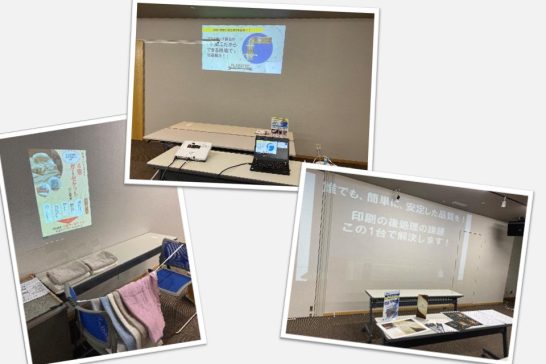 机上である程度考えがまとまったら実際にスペースを確保し、壁に掲示物をプロジェクターで映し、展示品を並べてみて模擬ブースチェック。模擬ブースチェックは実際の大きさでやることがホントに大事です。足りないもの、準備すべきことが明確になります。