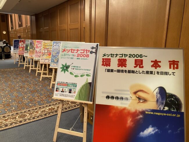 メッセナゴヤは今年で20回目をむかえる日本最大級の異業種交流型展示会。2005年の愛・地球博の理念を引き継ぐかたちで、2006年に第1回目が開催されました。会場入り口には歴代のポスターが!1回目は「環業見本市」というテーマだったのですね…。