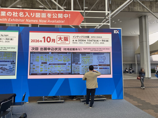 来年はほぼ同時期の10月7日(火)~9日(木)に同規模で開催されるようです。申し込み状況を示す掲示板はデジタルモニターに変わっていました。これまで「売約済」というシールが貼られていた部分には具体的な社名が表示されています。出展社の皆さんは熱心にご覧になっていました。
