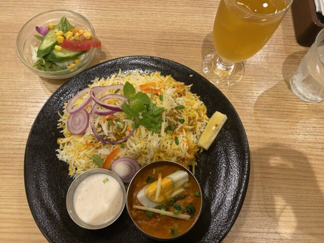 新横浜にあるタイ&インド料理屋さん。綺麗な店内でまぁまぁ混んでました。 チキンビリヤニを選ぶと好きなカレーを選ぶことができます。キーマの辛口を選択。サラダとヨーグルトがつく。ビリヤニはきちんとバスマティライス。パラパラで美味しい。骨付きチキンが2つ埋もれてて、結構ボリューミー。