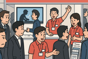 風が強いですね。落葉樹の葉が激しく舞っています。そんな大阪から今日も展活タイムズをお届けします。 「役割分担」と2つの「仕掛け」 展示会に出展していて、ブースの前に人だかりができている光景。 これは出展者にとって、まさに […]