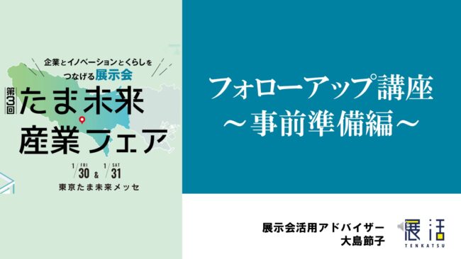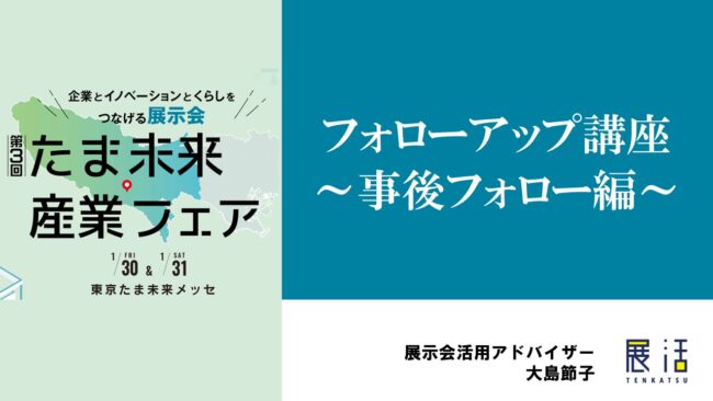 ② フォローアップ講座【事後フォロー編】 展示会は終わってからが大切です。名刺交換だけで終わらせず、その出会いをどうやって具体的な商談や受注といった「未来」に繋げるか。そのフォローアップの手法をお伝えしています。