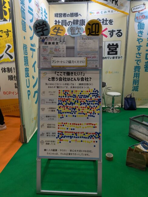 これこそが狙いです。 シールで埋め尽くされたこのパネルは、そのまま「若者のリアルな本音データ」になります。通りかかった経営者は、「今どきの若いもんは何を考えてるんだ?」と、気になってつい足を止めてしまいます。 そこでEnLinksさんはこう切り出せます。 「今の学生さんはこんな会社を求めています。御社はここ満たせていますか?」