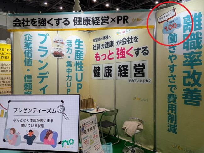 今日は昨年秋に開催されたメッセナゴヤ2025で初出展されたEnLinksさんのブース事例をご紹介します。EnLinksさんが扱うのは「健康経営」のサポート。 いわゆるコンサルティングや研修といった「目に見えないサービス」です。 こういった無形商材は機械や部品のように「置いておけば良さが伝わる」ものではないため、展示会では苦戦しやすいジャンルの一つです。
