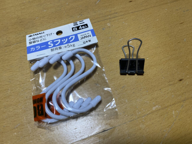- S字フックに、パネルにつけたクリップの金具(持ち手部分)を引っ掛けます。