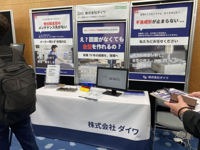 この展示会は、プラスチックとゴムの加工に関わるものづくり企業62社が出展する小規模な展示会です。 会場はとにかく活気にあふれ、来場者と出展者が熱心に商談する姿があちこちで見られました!