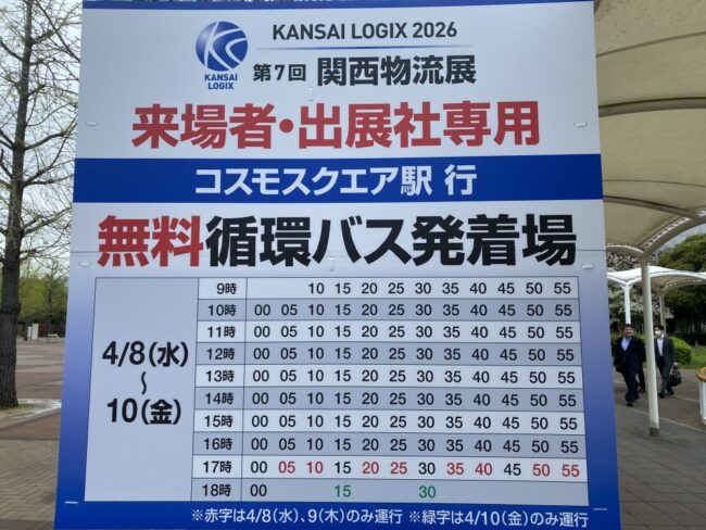 最後にこの展示会の素晴らしいところを一つお伝えさせてください。 昨年同様、コスモスクエア駅への無料循環バスが5分に1本出ていました。さらに駐車場も無料!来場者のアクセスに対するホスピタリティが最高でした。