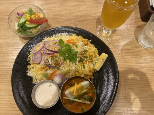 イオンモールの中にあるインド料理屋さん、2度目の訪問。今回はビリヤニを。中辛を選んだら程よい辛さ。チキンがしっかり入ってる。パクチーのアクレントや半熟卵もいい仕事してる。ただバスマティライスではないので、パラパラしてない。ピラフ感はある。(2025年8月)