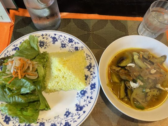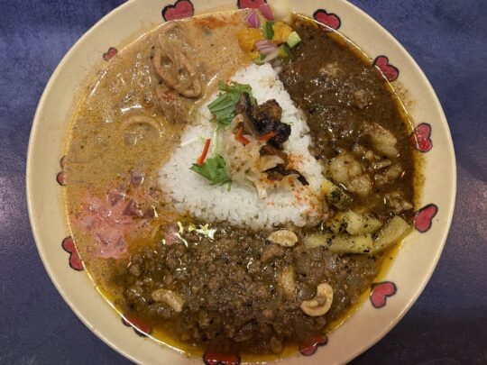 3度目の訪問サティヤさん。頻繁にメニューが変わるので何度訪れても新しい味を楽しめる♪ この日は5種類のメニューから“豚バラとナッツのカレー”と”あさりとキャベツのグリーンカレー”を選択。豚カレーは中辛。ぽってりした豚肉とカシューナッツのアクセントが楽しい。グリーンカレーは辛口。あさりは殻よりも身の数が圧倒的に多くて良いんですか?って感じ(笑)。貝の出汁をキャベツが吸って大変おいしかったです。ここはルールも厳しくなくてとても居心地が良いんですよね~。また来たいです。(2025年2月)