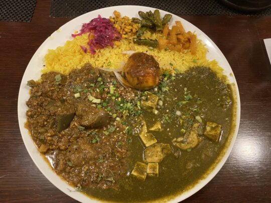 2度目の訪問。今回はマトンビリヤニとポークカレーの中辛を選択。ドリンクはアイスチャイ。サラダが付く。前に辛口にしてかなり辛かった記憶があるので今回は中辛に。もう少しパンチがほしいと思ってしまった。ちょうど良い加減が難しい。ビリヤニはパスマティライスがパラパラで求めてた食感。パパドもパリパリで美味。(2025年11月)