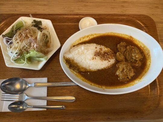 焼きたてのナンと豆カレーにサラダが付いたランチセット。カレーは辛さが選べます。ナンかごはんかも選択可。ナンは大きくて端はパリパリ&中はもっちり。豆カレーは食べやすいお味。コスパはめっちゃ良いと思います。ただ11時台に入って20分くらい滞在したと思うのですがずっと私一人で、逆にあまり居心地は良くなかったです。(2023年8月)